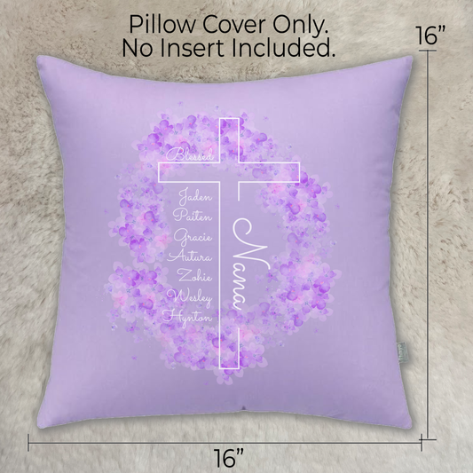 Personalized Blessed Cross Floral Pillow Cover – Custom Mother’s Day Gift for Mom, Nana, Grandma, Aunt – Two Sizes Available – Cotton Lavender Case