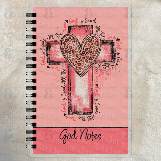 Personalized God Is Good Christian Journal – Salmon Pink Leopard Heart Cross Notebook, Faith Lined Journal with Name